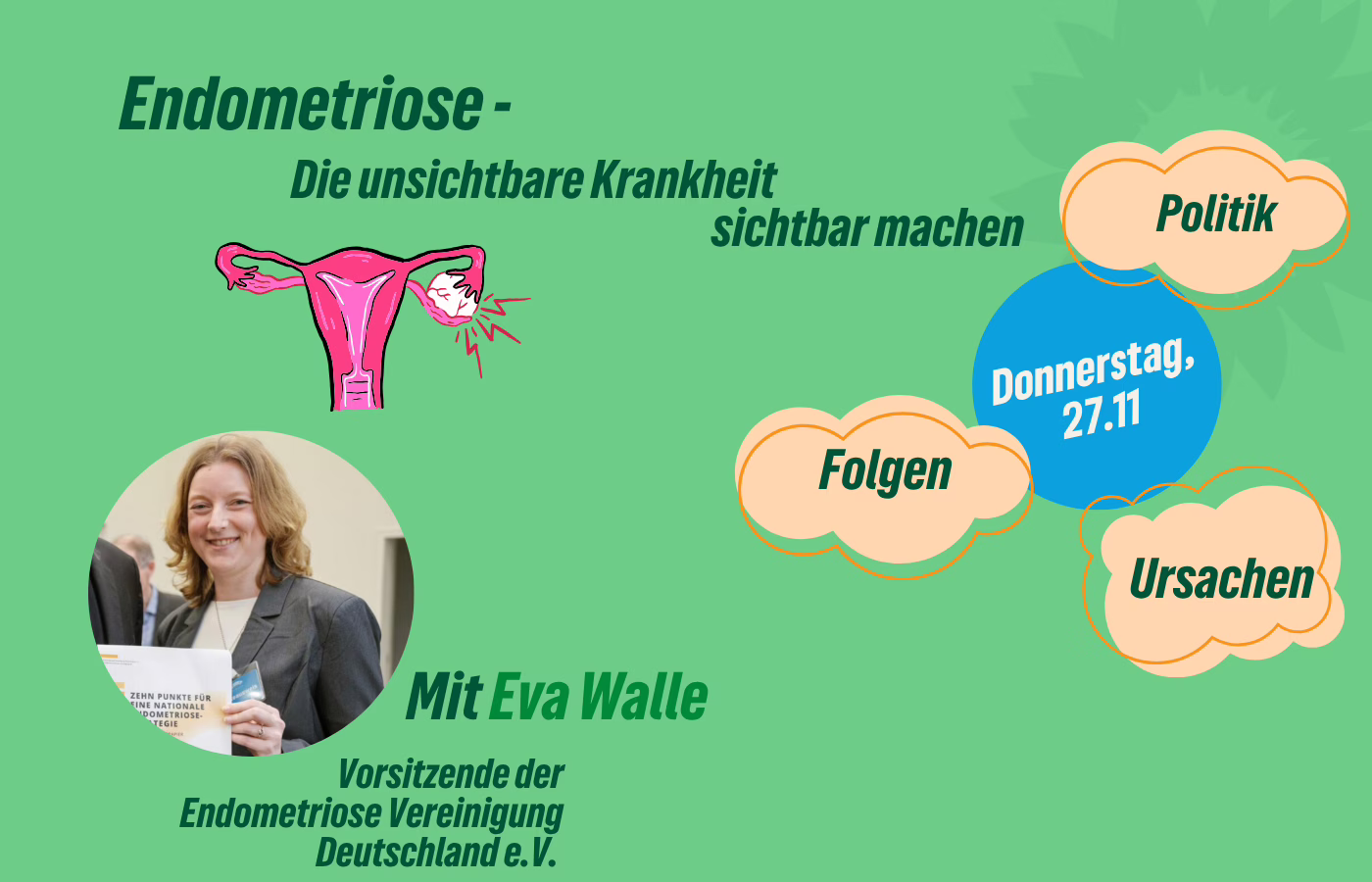 Mit dabei ist unsere Referentin Eva Walle, Vorstandsvorsitzende der Endometriose-Vereinigung e. V., die uns schon im Bundestagswahlkampf auf dieses Thema aufmerksam gemacht hatte.